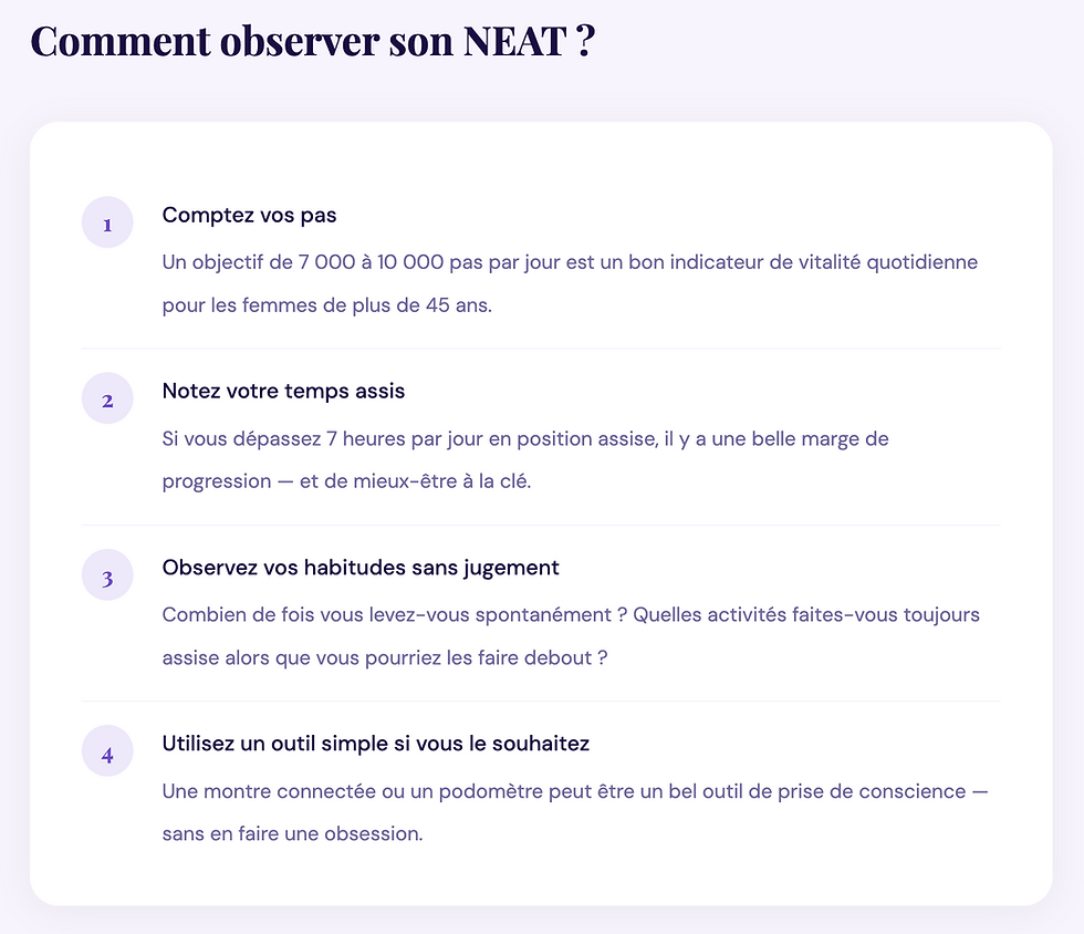 Ce que nous aimons profondément dans le concept de NEAT, c'est qu'il réconcilie beaucoup de femmes avec le mouvement. Pour celles qui n'aiment pas le sport, qui souffrent de douleurs articulaires ou qui n'ont tout simplement pas le temps ni l'énergie de s'entraîner régulièrement, le NEAT est une porte d'entrée accessible et bienveillante.